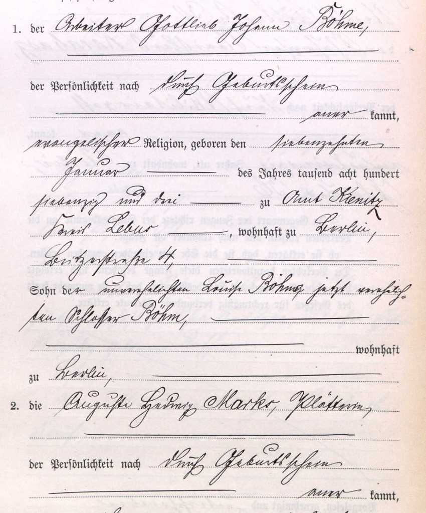 First page: 1. The Schmied (smith) Christian Heinrich Bernhard Böhm…of evangelic religion, born… in Saalfeld, Sachsen Heiningen, residing in Berlin Warschauer Straße 7, son of the Schneidermeister (master tailor) Johann Georg Heinrich Carl Böhm and his wife Christiane Frederike Henriette nee Franke, both deceased and formerly residing in Saalfeld. 2. The Marie Luise Böhme, without profession, …, of evangelic religion, …, born Kienitz, Kreis Lebus, reisiding in Berlin Warschauer Straße 7, daughter of the labourer Friedrich Böhme and his wife nee Engel, he deceased and formerly residing in Kienitz, she deceased and formerly residing in Berlin, Like · Reply · 8 hrs Ernst Simonsen Ernst Simonsen I read : Bride: worker Friedrich Böhme and Marie Engel, Groom: Schneidermeister Johann Georg Heinrich Carl Böhm and Christiane Frederike Henriette nee Franke. Watch the different names “Böhm” and ” Böhme”