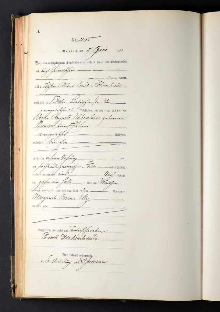 Sehr geehrte Frau Markgraf, in der zentralen Datenbank zu unseren Beständen erscheint Albert Emil Hohenhaus leider nicht. Das bedeutet, dass wir keine zu seiner Person angelegten Unterlagen verwahren. In unserer alten Meldekartei ist zu ihm ebenfalls keine Karte vorhanden. Zu Erna Martha Hedwig Hohenhaus ist auch keine Meldekarte vorhanden. Zu einer Elly Hohenhaus, geb. am 26.06.1901 in Berlin, evangelisch, gibt es eine Karte. Demnach hieß ihre Mutter Berta Hohenhaus, geborene Pinnow, geb. am 03.10.1879 in Kallies. Sie hat am 27.5.1947 beim Standesamt Tempelhof unter der Nummer 291/1947 Paul Schulz aus Magdeburg, geb. am 23.5.1900 in Magdeburg, geheiratet und dann in Mariendorf, Kurfürstenstr. 1 gewohnt. Sie war technische Angestellte. Mit freundlichem Gruß