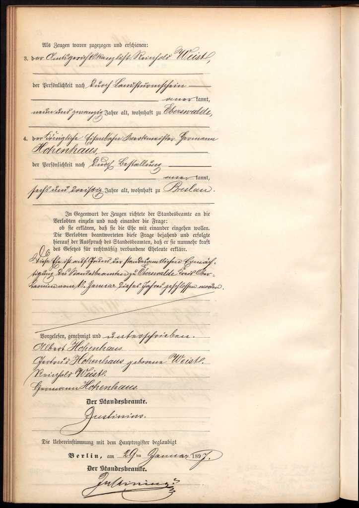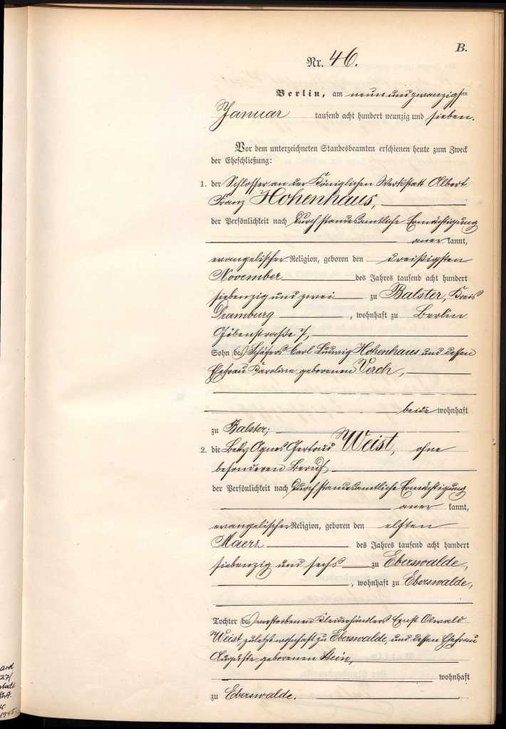 When Albert Franz Hohenhaus was born on November 30, 1872, his father, Karl Ludwig Hohenhaus, was 37 and his mother, Karoline Verch ( spelled on one document as Ferch ) , was 38.