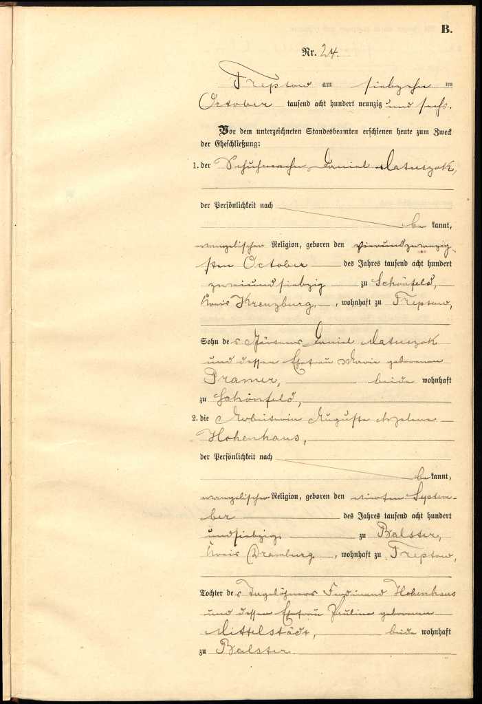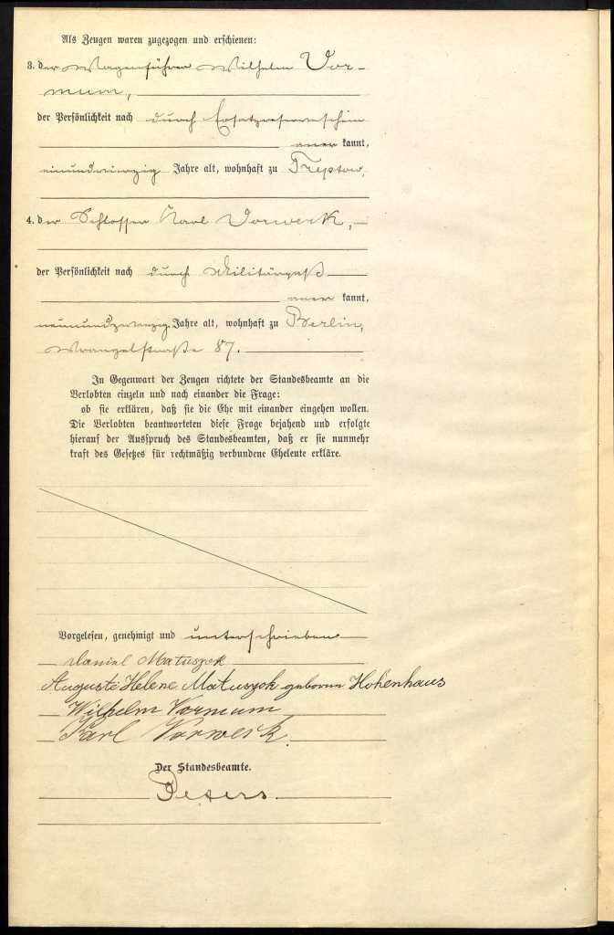 Auguste Helene Hohenhaus was born on September 4, 1870, the daughter of Pauline Mittelstadt ( Platterin/Ironer ) and Ferdinand Hohenhaus . She married Daniel Matuszok on October 17, 1896.