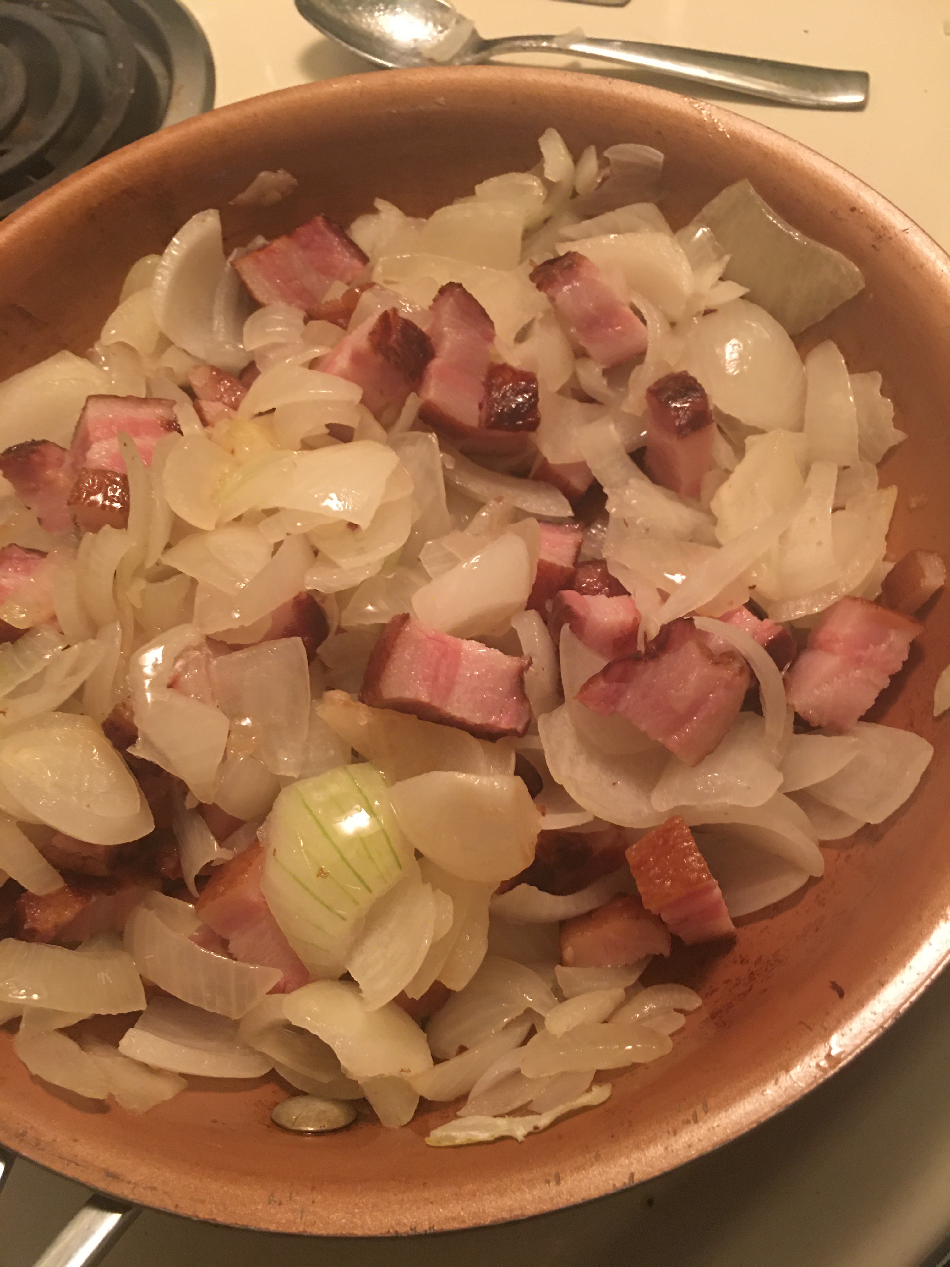 Wait … until you’ve dried up your bacon and onion mixture … once that has fried up… add your mixture to the sauce…