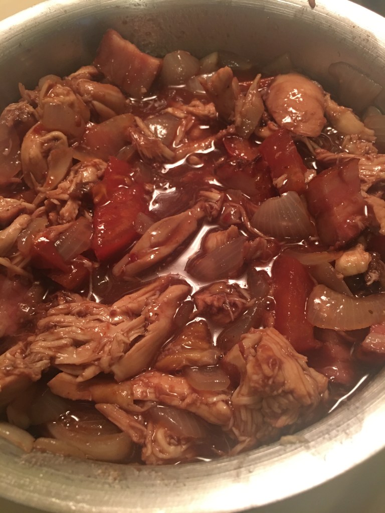 Next… take your chicken and add it to the pot with your sauce and cook down ( to preference )