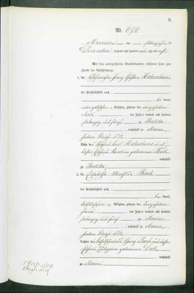 What I know about Elisabeth Mathilde Bach is little. I do know when Elisabetha Mathilde Bach and her twin sister Elisabeth Mathilde were born on June 13, 1875, in Mainz, Rhineland-Palatinate, Germany, their father, Georg, was 25 and their mother, Philippine, was 22. She married Franz Gustav Hohenhaus on December 17, 1898, in Hesse, Germany. She died on January 18, 1901, in her hometown at the age of 25.
