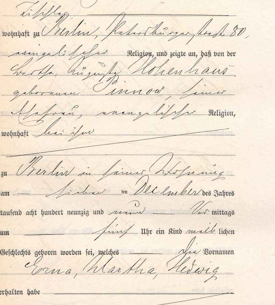 My Grandmother, Erna Martha Hedwig Hohenhaus went by Erna and she died when I was only 1 year old. When Erna Martha Hedwig Hohenhaus was born on December 7, 1899, her father, Albert Emil Hohenhaus , was 22, and her mother, BerthaAuguste Pinnow, was 20.