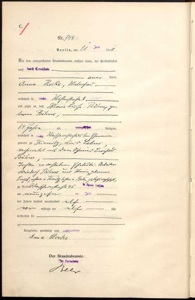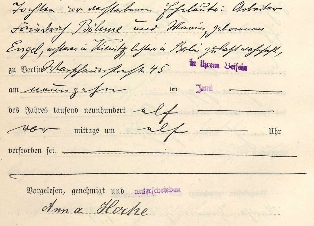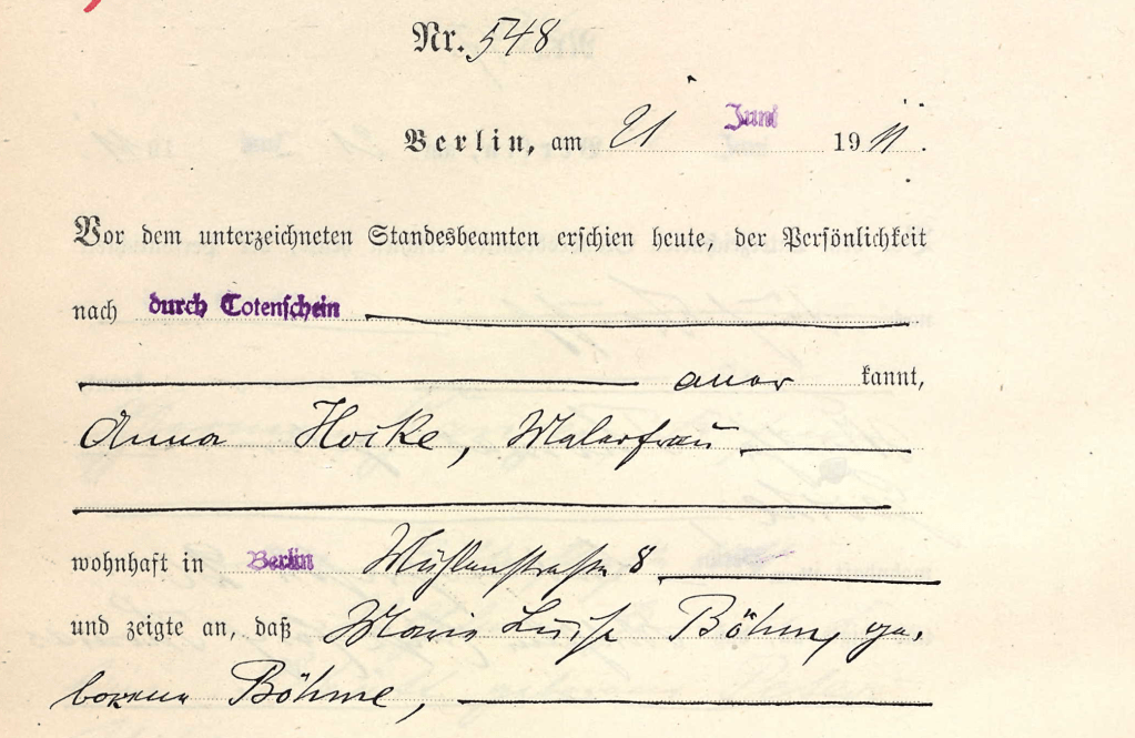 marriage … : page B, Nr. 350, Berlin am achtzehnten Mai tausend acht hundert neunzig und drei (read 18.Mai 1893) Vor dem unterzeichneten Standesbeamten erschienen heute zum Zweck der Eheschließung: 1. der Schmied Christian Heinrich Bernhard Böhm der Persönl…See More