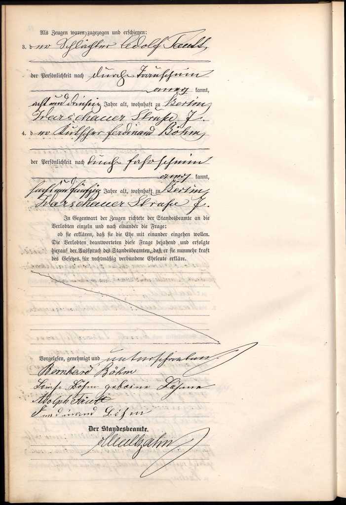 I read 2 nd. Page as : Als Zeugen waren zugegen und erschienen: 3. der Schlachter Adolf Fautt (?) der Persönlichkeit nach durch Trauschein anerkannt, acht und dreißig (38) Jahre alt, wohnhaft zu Berlin, Warschauer Straße 7 4. der Kutscher Ferdinand Böhm der Persönlichkeit nach durch Fahrschein anerkannt, sechs und fünfzig (56) Jahre alt, wohnhaft zu Berlin, Warschauer Straße 7. In Gegenwart der Zeugen richtete der Standesbeamte an die Verlobten einzeln und nach einander die Frage: ob sie erklären, daß sie die Ehe mit einander eingehen wollen. Die Verlobten beantworteten diese Frage bejahend und erfolgte hierauf der Ausspruch des Standesbeamten, daß er sie nunmehr kraft des Gesetzes für rechtmäßig verbundene Eheleute erkläre. Vorgelesen, genehmigt und unterschrieben Bernhard Böhm, Luise Böhm geb(orene) Böhme, Adolph Fautt, Ferdinand Böhm, der Standesbeamte Maltzahn