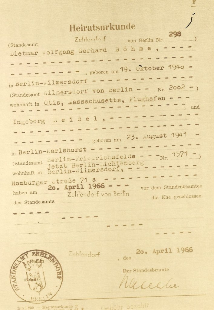 He went back to Germany to find my mom as he was in love with her and in the April of 1966 they were married at the Standesampt in Berlin, Germany. They sailed on the SS UNITED STATES ( docked in Philadelphia ) and my brother was born on Otis AFB in October of 1966.