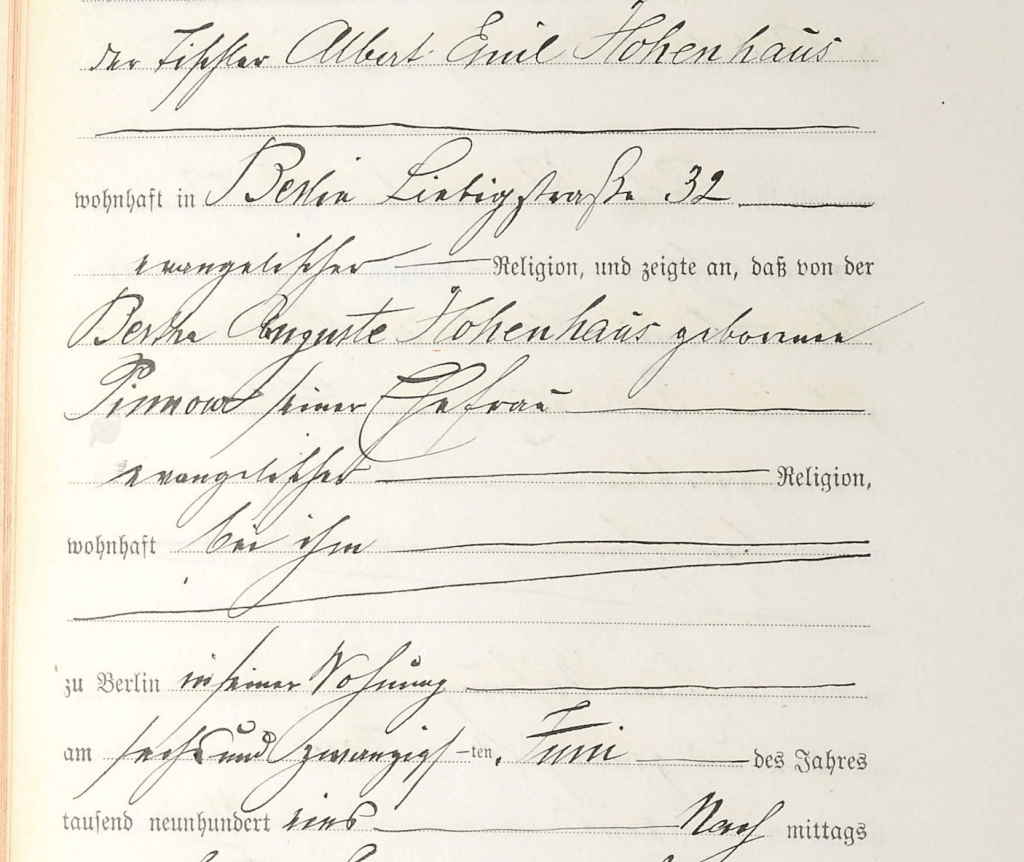 in der zentralen Datenbank zu unseren Beständen erscheint Albert Emil Hohenhaus leider nicht. Das bedeutet, dass wir keine zu seiner Person angelegten Unterlagen verwahren. In unserer alten Meldekartei ist zu ihm ebenfalls keine Karte vorhanden. Zu Erna Martha Hedwig Hohenhaus ist auch keine Meldekarte vorhanden. Zu einer Elly Hohenhaus, geb. am 26.06.1901 in Berlin, evangelisch, gibt es eine Karte. Demnach hieß ihre Mutter Berta Hohenhaus, geborene Pinnow, geb. am 03.10.1879 in Kallies. Sie hat am 27.5.1947 beim Standesamt Tempelhof unter der Nummer 291/1947 Paul Schulz aus Magdeburg, geb. am 23.5.1900 in Magdeburg, geheiratet und dann in Mariendorf, Kurfürstenstr. 1 gewohnt. Sie war technische Angestellte. Mit freundlichem Gruß Dr. Martin Luchterhandt LA-III Landesarchiv Berlin Eichborndamm 115-121 13403 Berlin Tel. 030/90264-288 Fax 030/90264-201