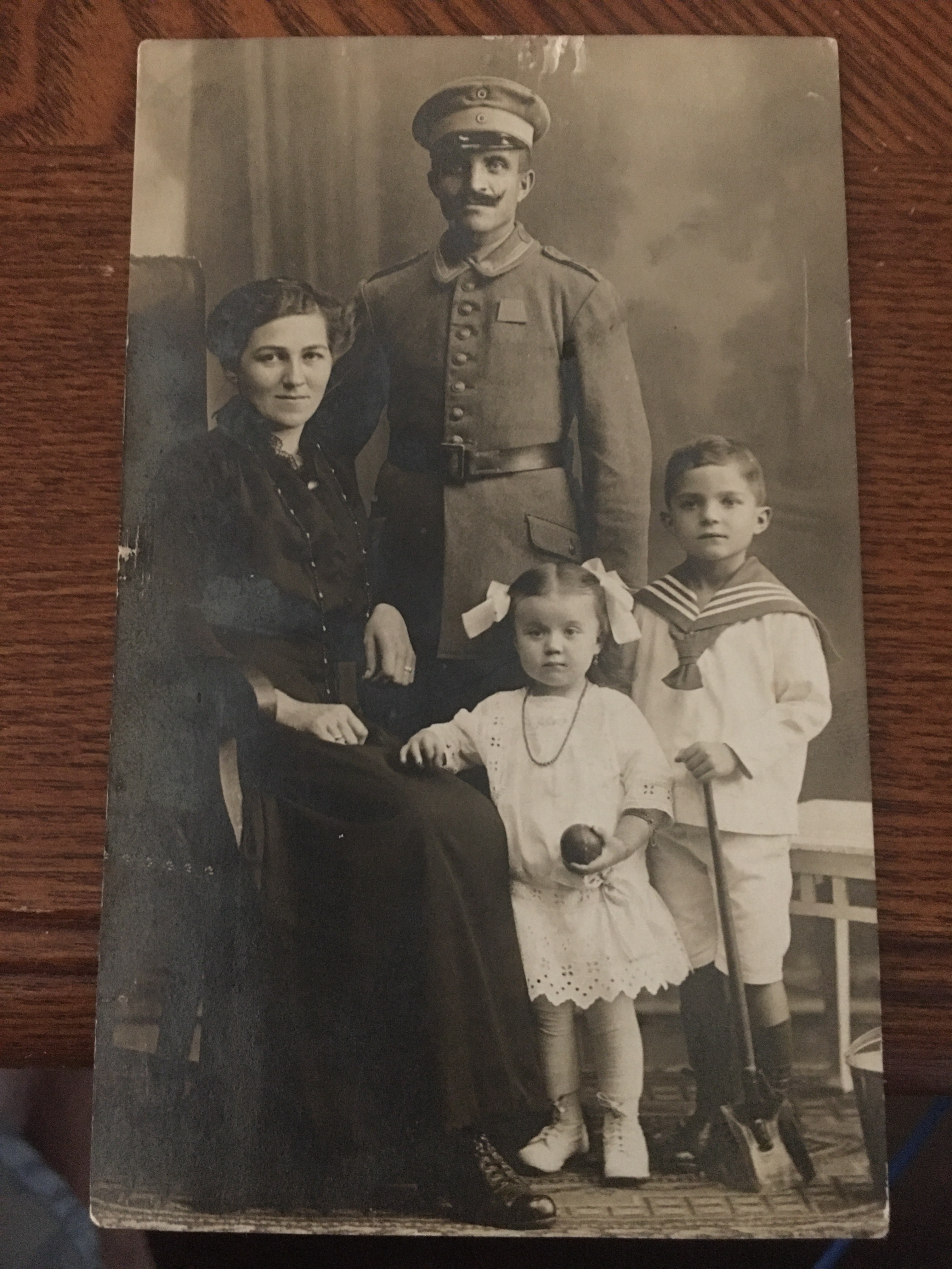 Going through photos today I found these two pictures. I had to sit at amazement as I am almost 43 and have met my Tante Hildi . We visited her often as she lived Am Kanal 1, Potsdam, Germany and when we visited my family in Berlin, we would always go and visit or we would meet up and visit in a local bakery for “ kaffee und kuchen “ or “ einem Eis” we would sometimes take a walk in the Grunewald and sit by the water or just go up to her place and visit with her. Her place cluttered but always clean. In Germany the apartments are smaller than they are here in the USA and it seemed that a house full of furniture was in the space of a “ studio” apartment here. I remember we would always sit and talk about family, but whenever I asked she would not let me record it or write it down. So I’m amazement I found this photo … it’s of her brother!!!